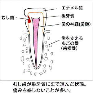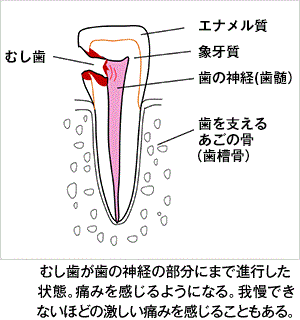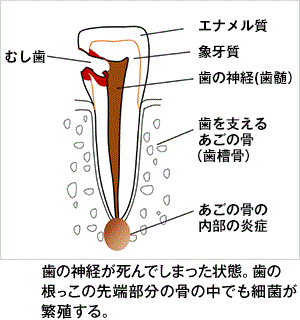 こうなると耐えがたい痛みが出たり神経が死んでしまって中で細菌が繁殖し、ついには歯の根っこの先端部分のあごの骨の中に細菌の巣をつくるようになります。あごの骨の中で炎症がひどくなると、顔全体が大きく腫れあがるようなこともありますし、熱が出たり、全身にも悪い影響が出ることがあります。
