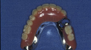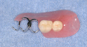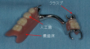 部分入れ歯は虫歯や歯槽膿漏、外傷などによって失われた歯や歯肉などの形態と機能を回復するために用いる取り外しできる装置です。部分入れ歯は会話や食事中に入れ歯が外れないように残っている歯にかけるバネ(クラスプ)と人工の歯(人工歯)、歯のない部分の粘膜の上に乗るピンク色の床(義歯床)などからできています