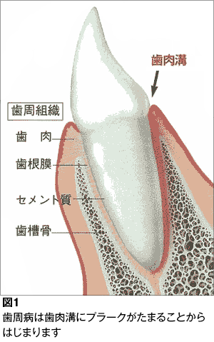 歯周病の初期の段階では、炎症が歯と歯ぐき(歯肉)に限局し、歯と歯ぐきの境目が赤く腫れたり、触れると出血したりします。健康な状態と比較して歯ぐき(歯肉)が腫れて盛り上がりますので、歯肉溝が深くなり、これを歯肉ポケット(仮性ポケット)と呼びます