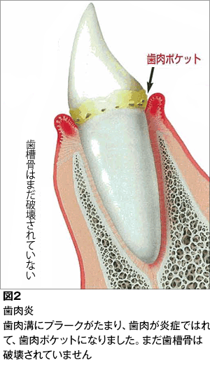 この段階では、炎症は歯の頸の部分に限られているので、早く発見して、歯と歯ぐきの周りのプラークを歯ブラシで一生懸命除去すれば、健康な状態に戻すことが可能です