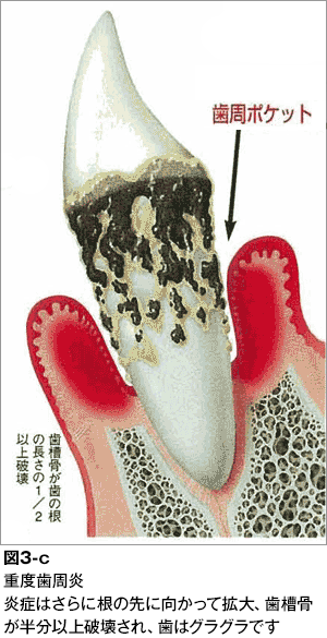。歯ぐきの腫れや出血だけでなく、歯と歯ぐきの境目の部分が壊れて隙間が深くなり、歯周ポケット(真性ポケット)を形成します。プラークがさらにこの隙間に沿って侵入すると、根の先の方へとさらに破壊が進行してゆきます。そうすると歯を支えている歯根膜線維や歯槽骨が壊されて、歯がぐらぐらと揺れるようになってきます。症状としては、歯の揺れの他に、歯ぐきの腫れ、出血、ポケットからの排膿、口臭などがみられるようになります。一般的に慢性歯周炎の病名で、その進み具合から軽度・中等度・重度に分けられます。歯ぐきの炎症が急激に生じると、急性症状として高度な腫れや強い痛みを伴うことがあります。